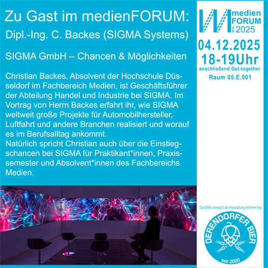 Wir freuen uns, Sie am 04.12.2025 um 18:00 Uhr zum nächsten medienFORUM im ISAVE, Raum 05.E.047 begrüßen zu dürfen.